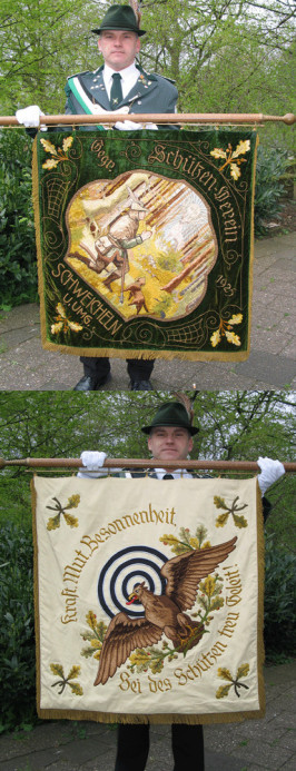 Die Schützenfahne dient der Traditionspflege. Unsere Schützenfahne ist im Jahre 1928 geweiht und übergeben worden. Das samtene Fahnentuch stellt Hubertus, den Schutzheiligen der Jäger dar, der vor dem Geweihten niederkniet und angesichts des Kreuzes bekehrt worden ist, so dass er fortan der Jagd entsagte. Die Rückseite zeigt eine Zielscheibe, die den Schießsport symbolisiert, sowie einen Adler, welchen als Königsvogel gilt. Auf einem Holzadler schießen wir in jedem Jahr unseren neuen König aus.