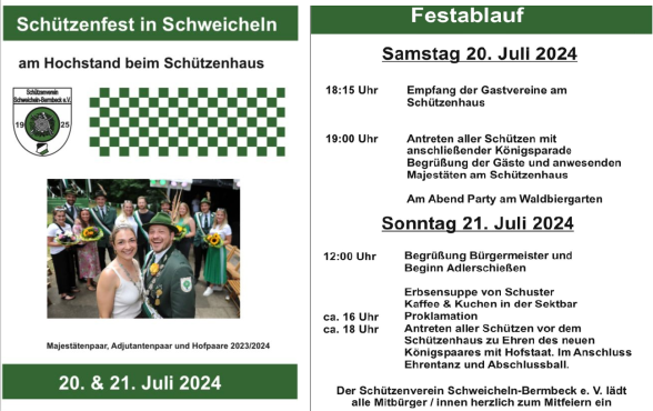 Am Sa, 20.07.24 und So, 21.07.24 findet wieder das jährliche Schützenfest in Schweicheln statt.